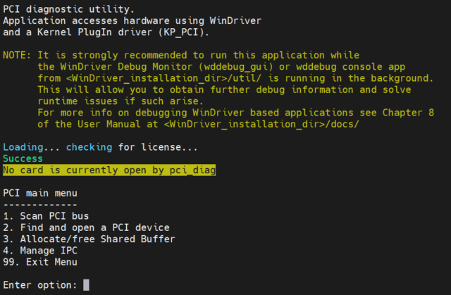 • pci_diag – General-purpose PCI example: read/write PCIe configuration space, PCIe I/O, memory BARs, and interrupt handling. Supports x86_64 and ARM64 QEMU emulation.